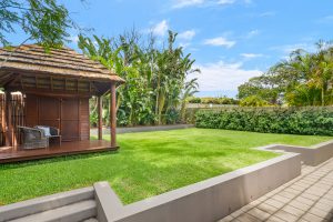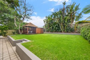 • Level grassed yard surrounded by manicured gardens