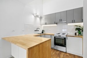 • Kitchen showcasing timber benchtops, sleek matte black tapware and a distinctive pitched roof with skylights that brighten the space, creating a warm and inviting space