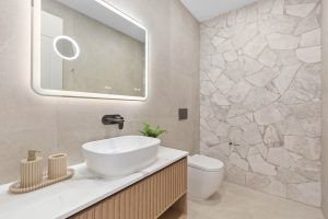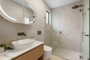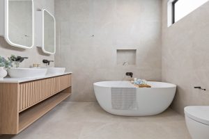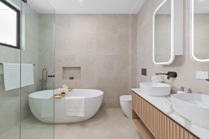 • Main bathroom + additional wash closet downstairs, both exuding timeless refinement, adorned with floor-to-ceiling tiles and statement feature walls, with the upstairs main offering a freestanding bath and a generous frameless shower.