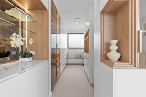 • Chef’s kitchen, a statement of sophistication, showcasing sleek stone benchtops, an integrated fridge and dishwasher, premium Fisher & Paykel appliances, and a spacious walk-in pantry, expertly balancing style and functionality.