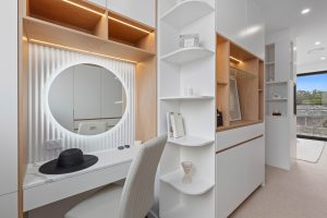 • Master suite, a luxurious retreat, boasting a bespoke walk-in robe with a built-in vanity desk, a lavish ensuite featuring a freestanding bath, and a private balcony capturing elevated views over the serene streetscape.