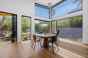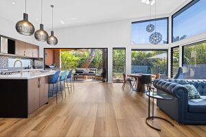• Open plan living and dining area crowned by soaring vaulted ceilings and wrapped in floor-to-ceiling windows, allowing natural light to stream across the space while sculptural pendants accentuate the sense of scale and elegance.