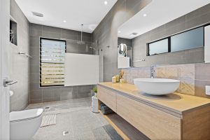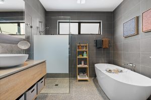 • Contemporary main bathroom showcasing a freestanding bathtub, walk in frameless shower, floating vanity with under bench storage, LED mirror and full-height grey tiling contrasted against crisp white and oak accents, plus a separate European laundry.
