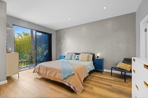 • Master retreat flowing onto a private deck overlooking a tranquil Balinese inspired garden, featuring a custom walk-in robe illuminated by LED strip lighting and a luxurious ensuite with an oversized frameless shower and floating vanity.