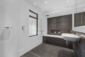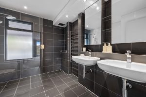 • Main bathroom featuring a frameless shower, two vanities with mirrored cabinetry, and a bathtub set against striking grey tiles, beautifully contrasted by white surrounds to create a spa-like atmosphere.