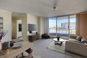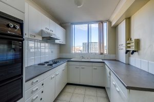 Set within a secure complex with lift access to the eighth floor, this apartment presents a compelling opportunity for first home buyers or investors seeking a low maintenance residence in an ultra convenient location. The interiors are thoughtfully arranged with practicality in mind and offer scope for updating and personalisation, comprising a functional kitchen, two bedrooms positioned within their own wing, two bathrooms, and a generous living and dining area enhanced by expansive glass panes that draws natural light and the outdoors into the space. The two balconies effortlessly complement the internal living spaces providing a private space to unwind or entertain, with the main bedroom balcony enjoying elevated views of the city skyline.
