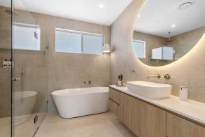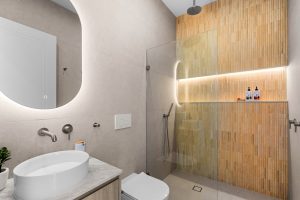 • The main bathroom features a stylish kit-kat flute feature wall, full-height neutral tiles, a frameless dual shower, and a stone-topped floating vanity with LED mirror