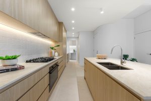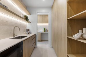 • Designer kitchen featuring a timber-fluted island, stone benchtops, light oak cabinetry and mosaic splashback, complete with a 900mm gas cooktop, 900mm oven, integrated dishwasher and a fully equipped butler’s pantry