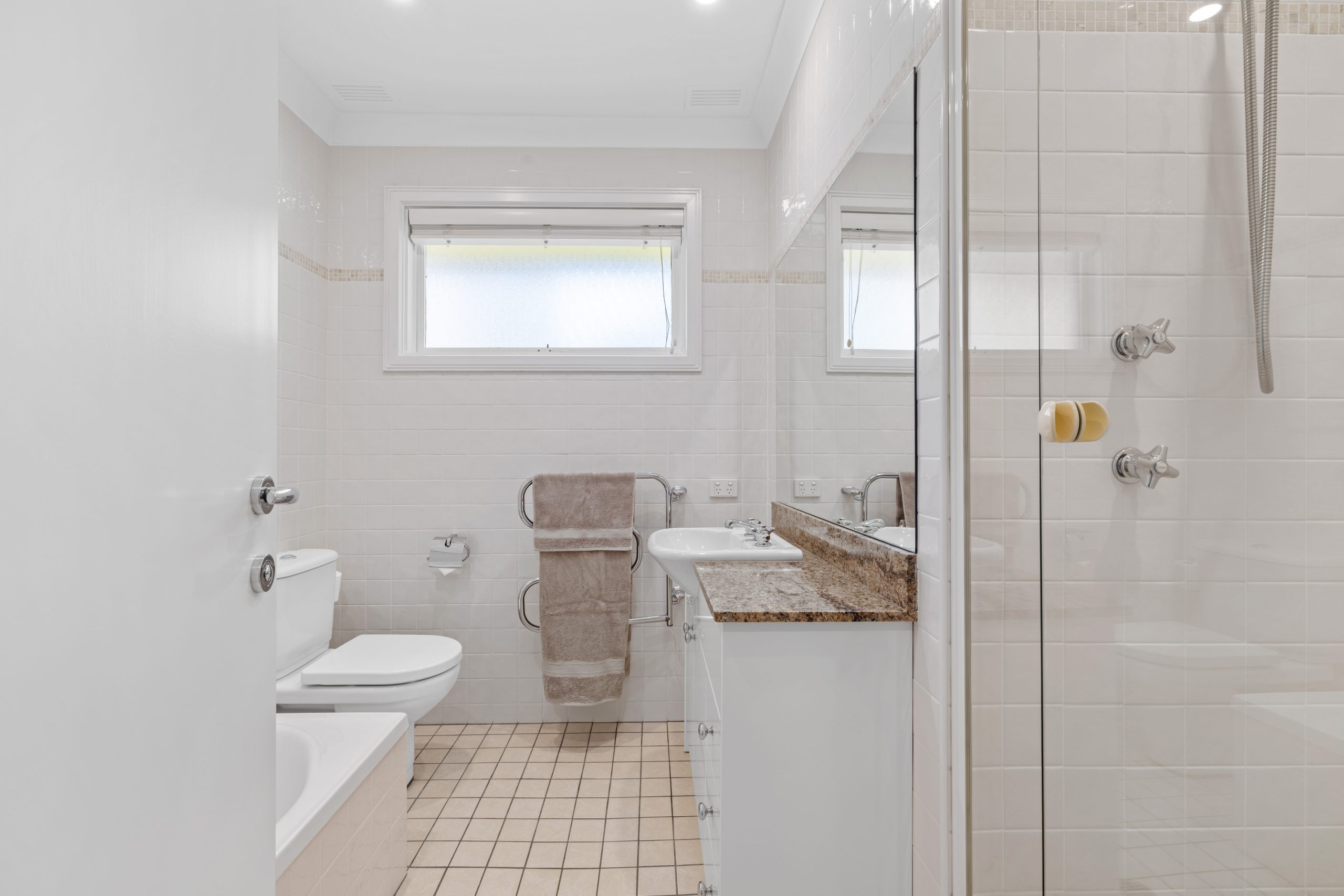 • Main bathroom fitted with a separate bath and shower, stone-top vanity, heated towel rail and full-height tiling + a separate internal laundry offering access to the removable rotating clothesline