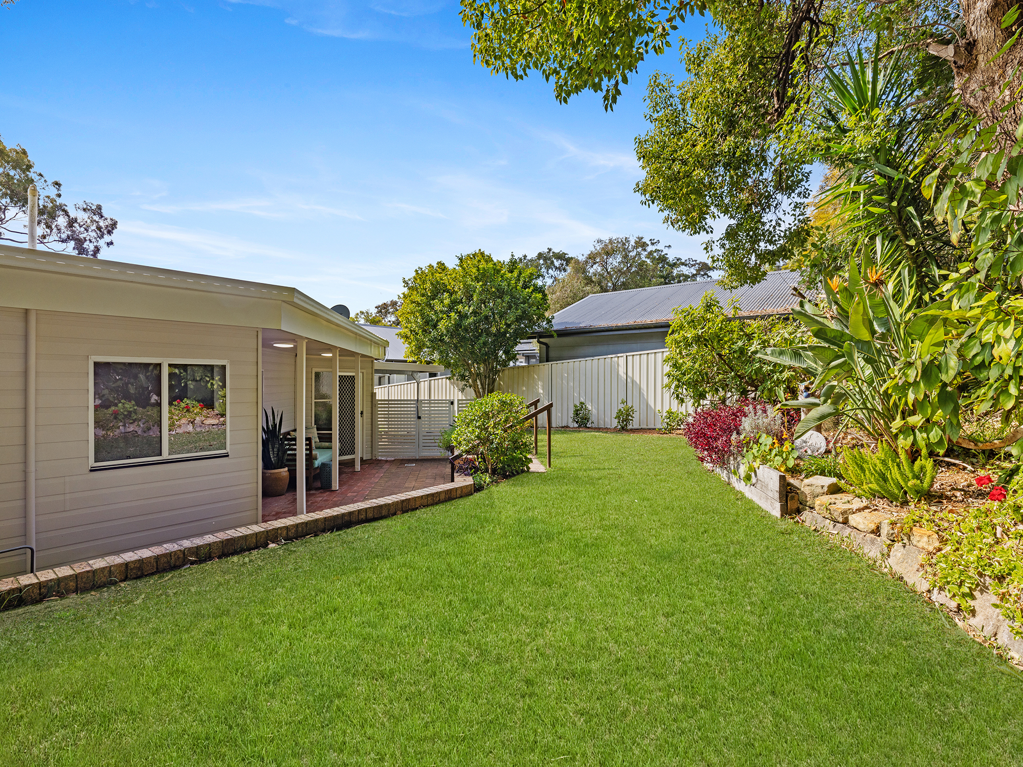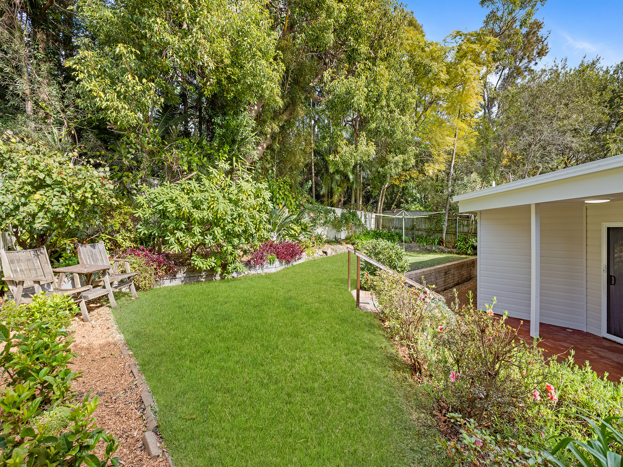 • Covered entertaining alfresco overlooking level grassed yard with manicured gardens