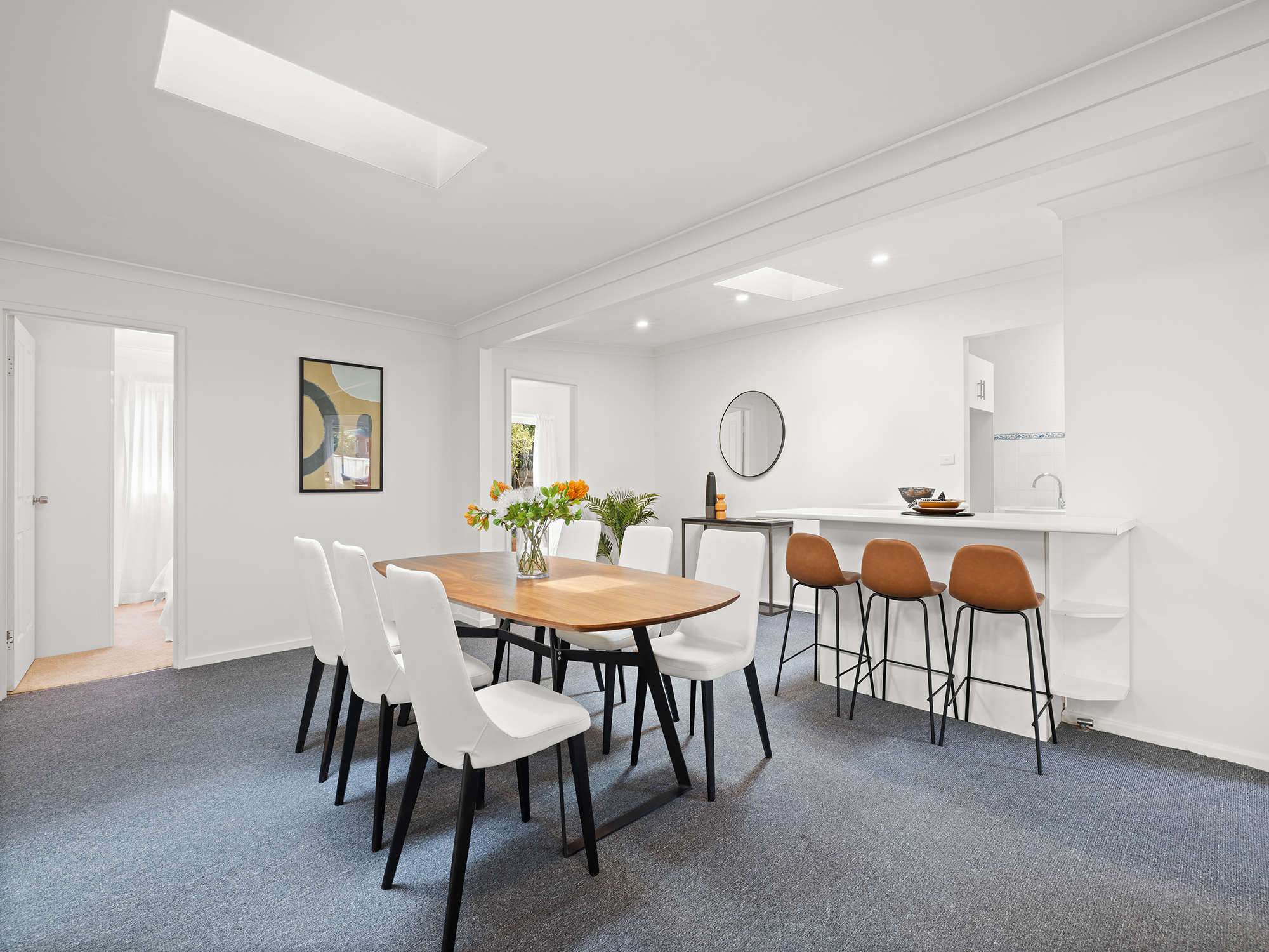 • Open plan kitchen with ample cabinetry and breakfast bar adjoining dining room