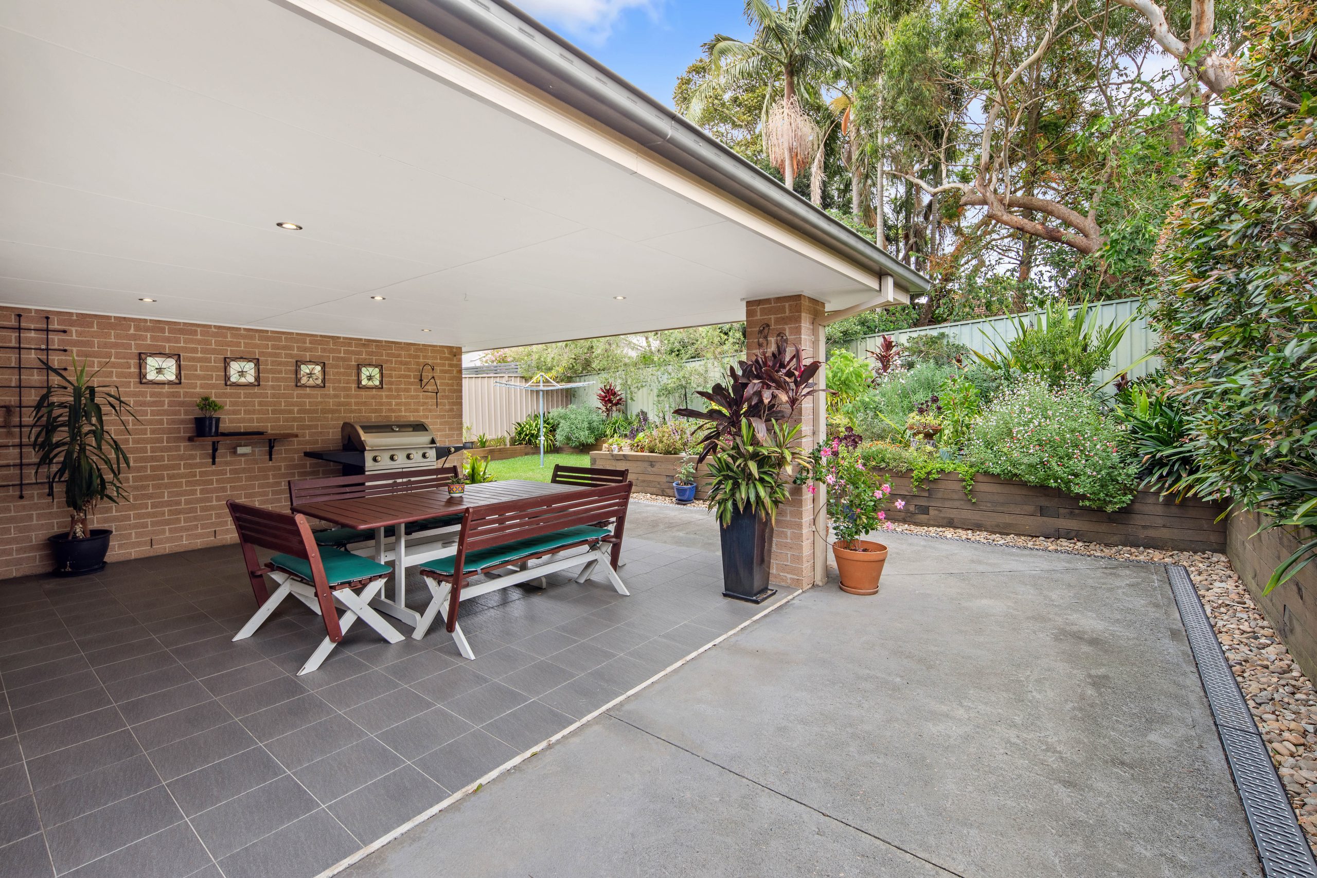 • Covered entertaining alfresco overlooking the manicured garden bed, level grassed lawn with side access and a rotating clothesline