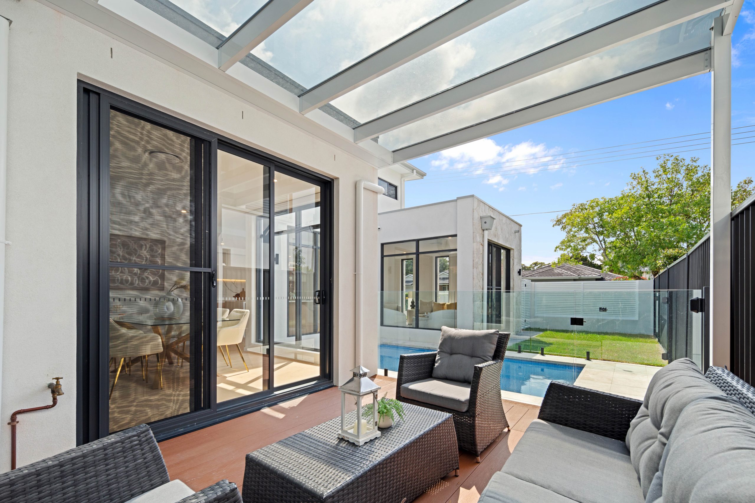 • Covered alfresco entertaining area, an exquisite extension of the home flowing off the dining area, complete with a built-in outdoor kitchen and BBQ, overlooking a sunlit inground swimming pool and a pristine, manicured level lawn.