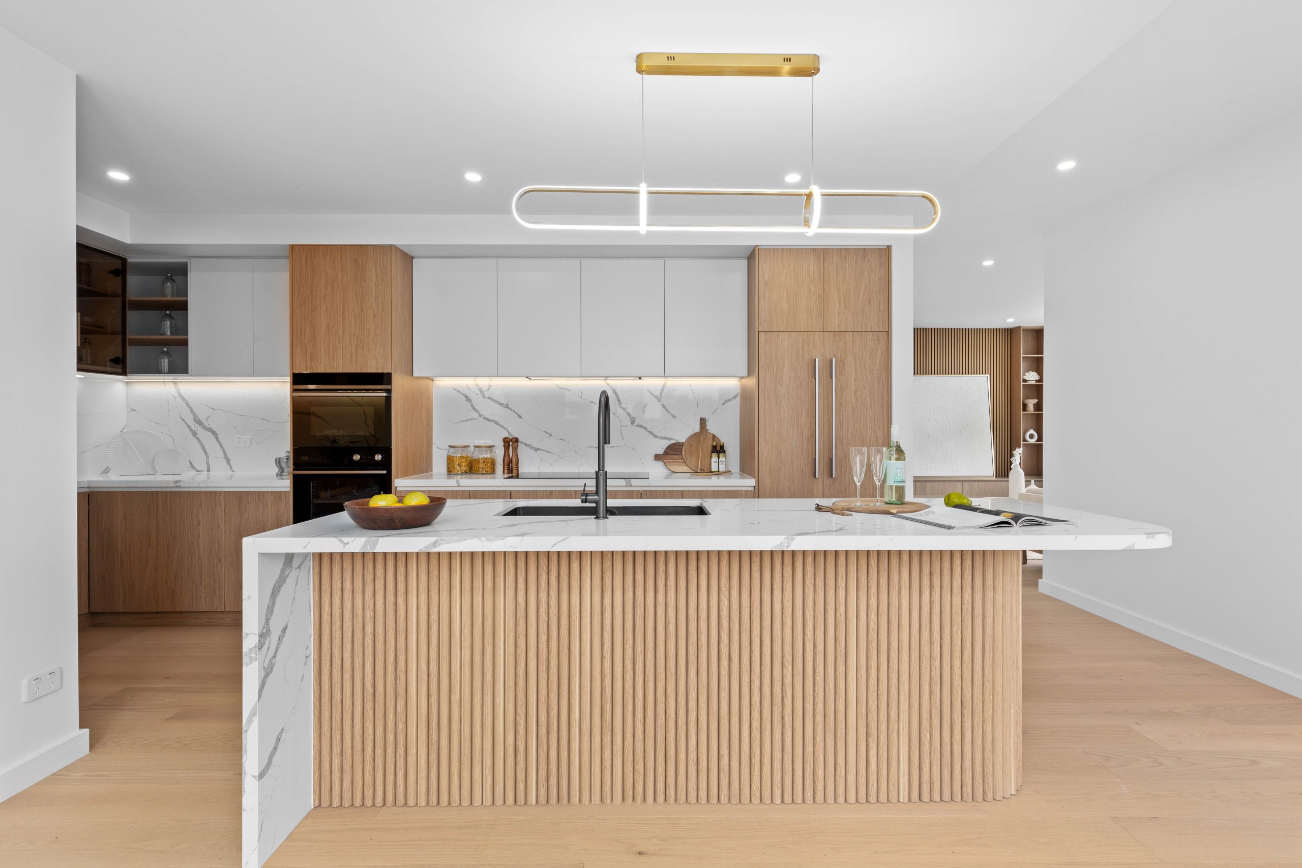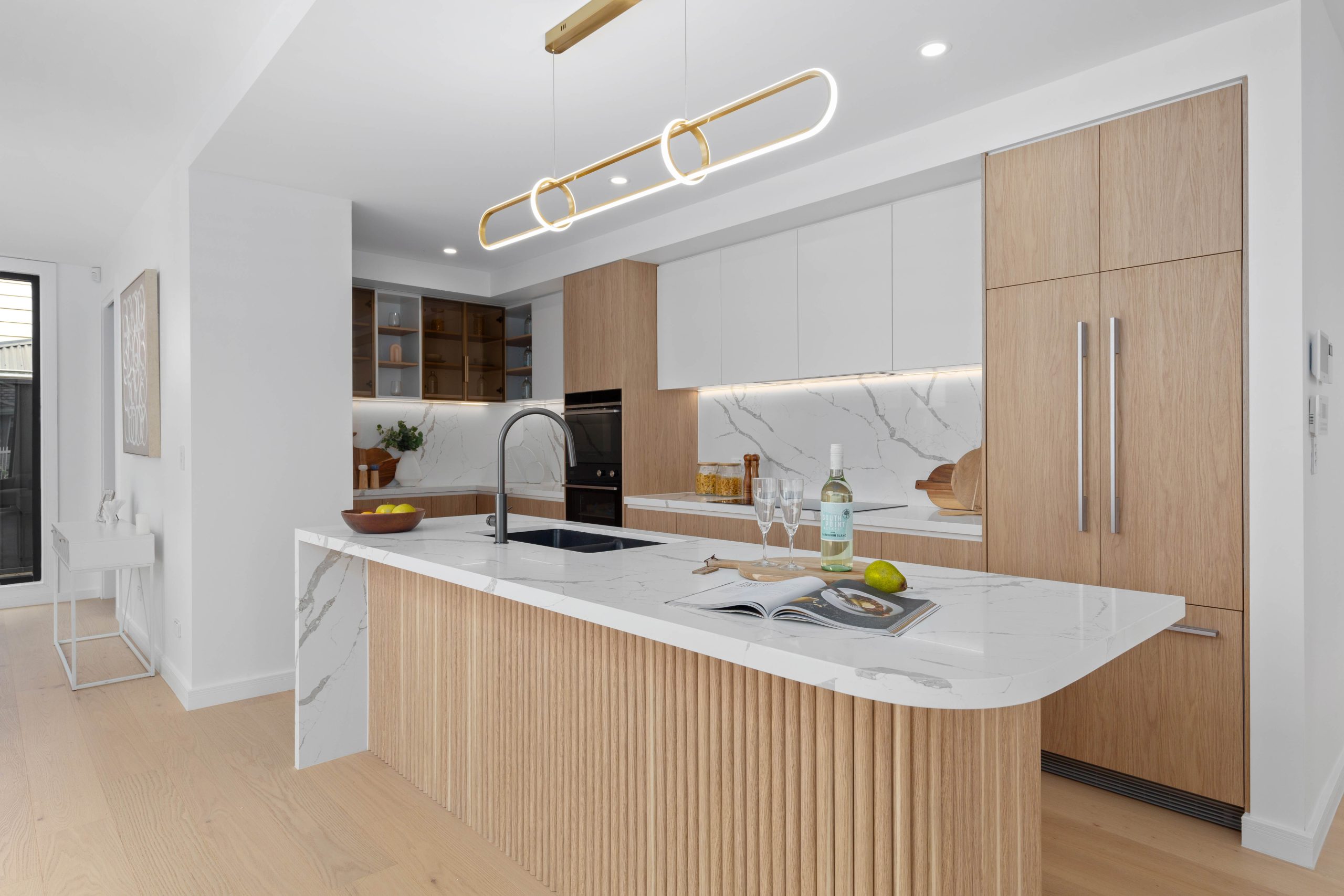 • Chef’s kitchen, a statement of sophistication, showcasing sleek stone benchtops, an integrated fridge and dishwasher, premium Fisher & Paykel appliances, and a spacious walk-in pantry, expertly balancing style and functionality.