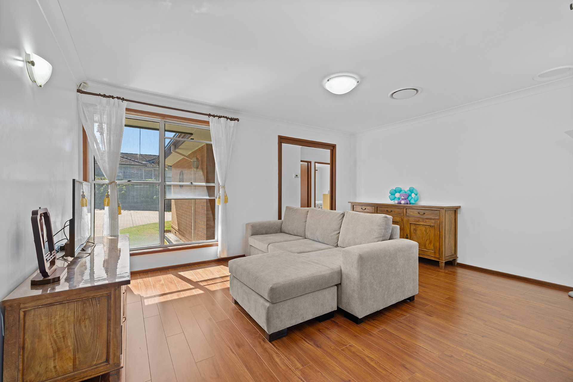 • Living and dining area bathed in natural sunlight, complete with timber floorboards, ducted air conditioning and wide windows framing both the front and rear terraces