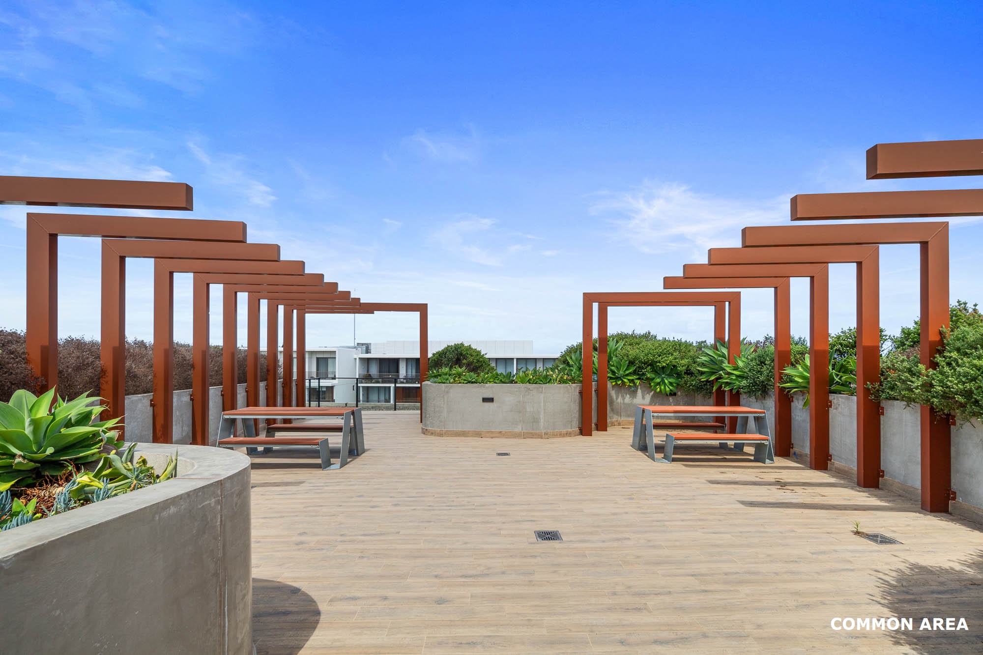 • Covered entertaining balcony with views over complex common area + access to communal roof top BBQ area showcasing a scenic city outlook
