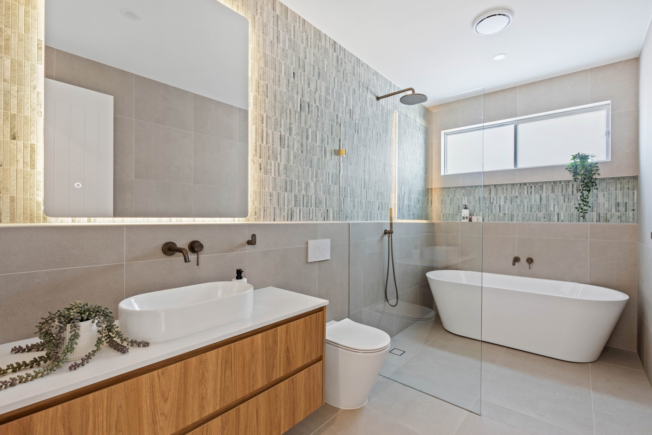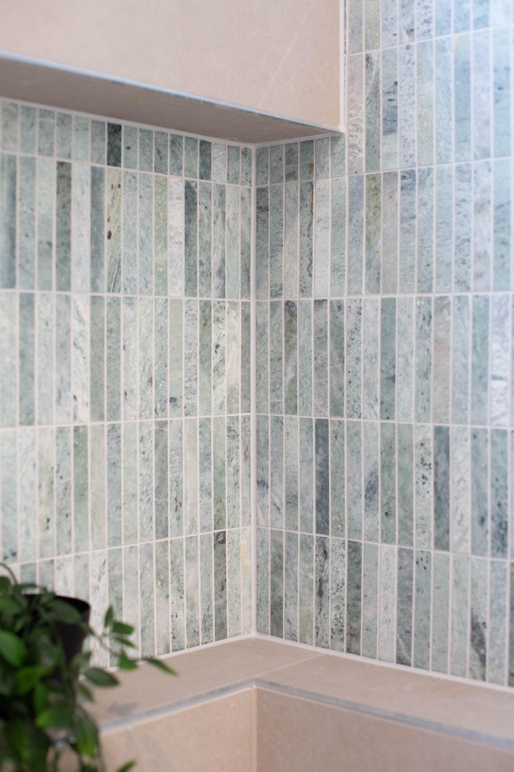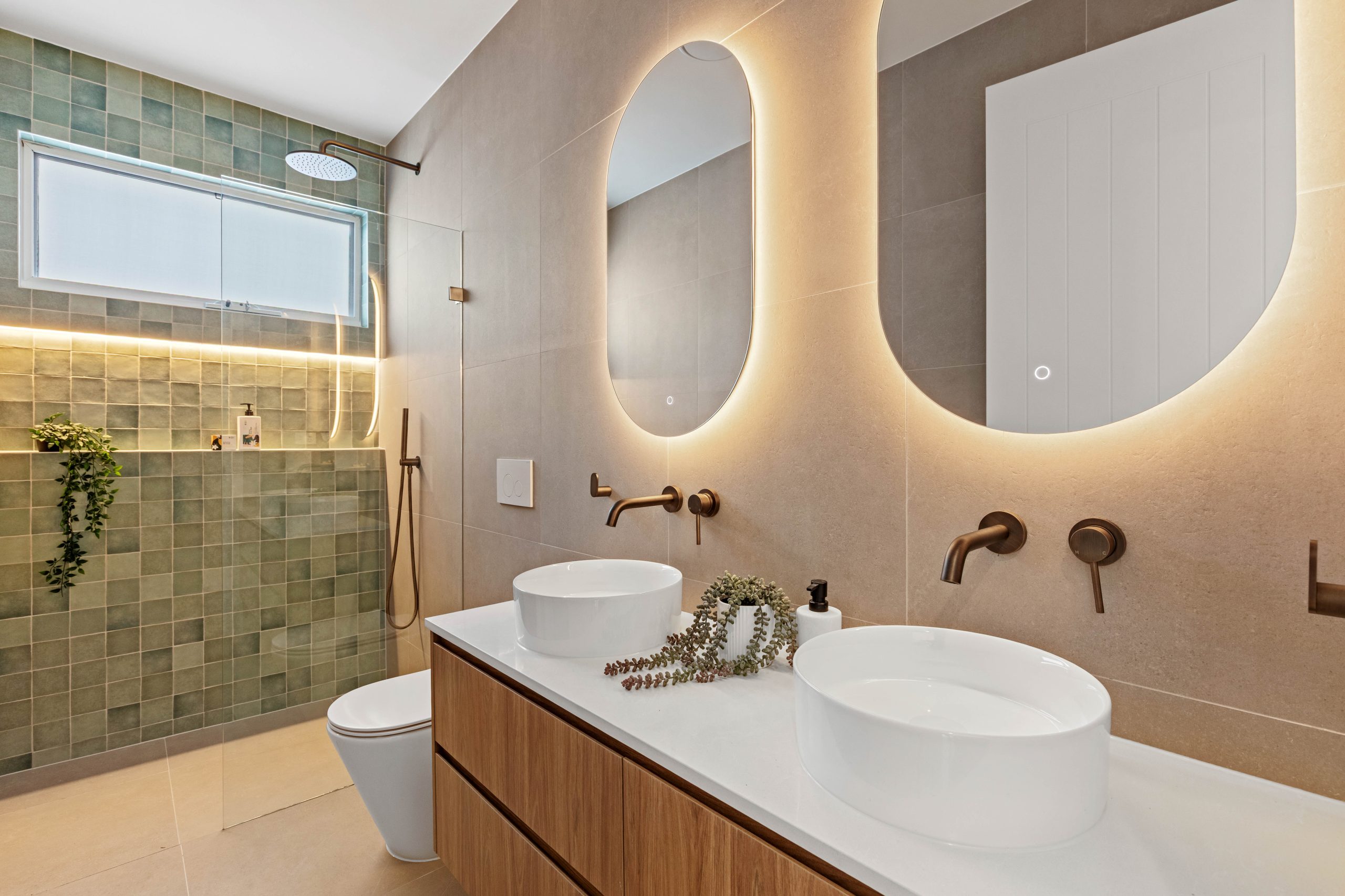 • Bathrooms finished with bespoke tapware, floating stone-and-timber vanities and a layered palette of natural textures. The main bathroom is defined by a sculptural freestanding bath, sleek frameless shower and a feature wall where natural green marble mosaic kit-kat tiles extend from the niche across the adjoining wall, creating a striking architectural focal point.
