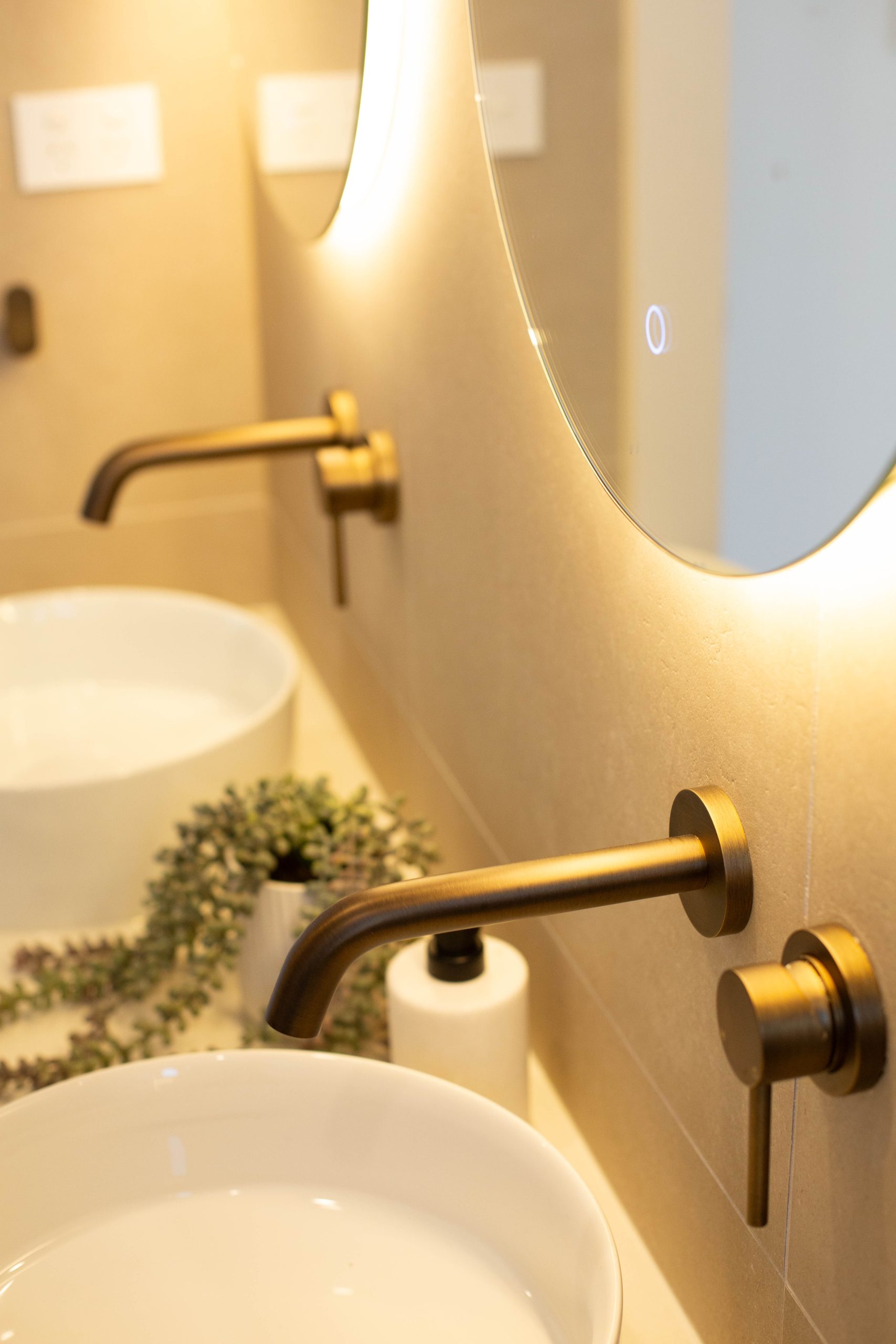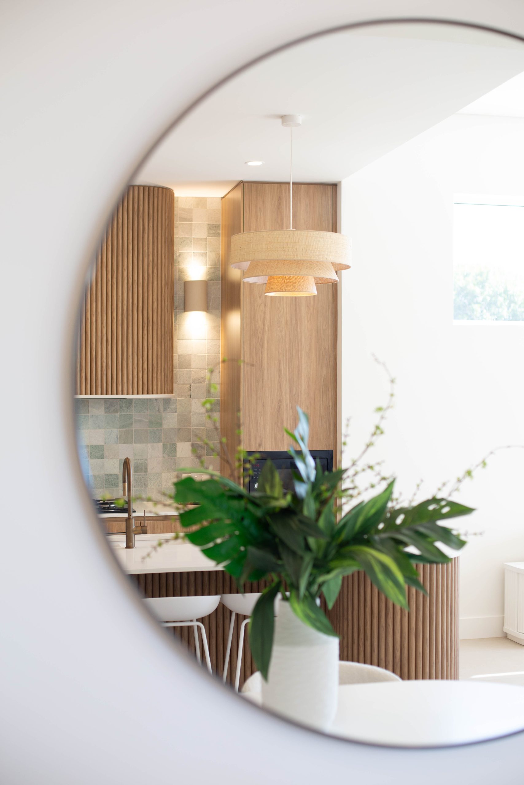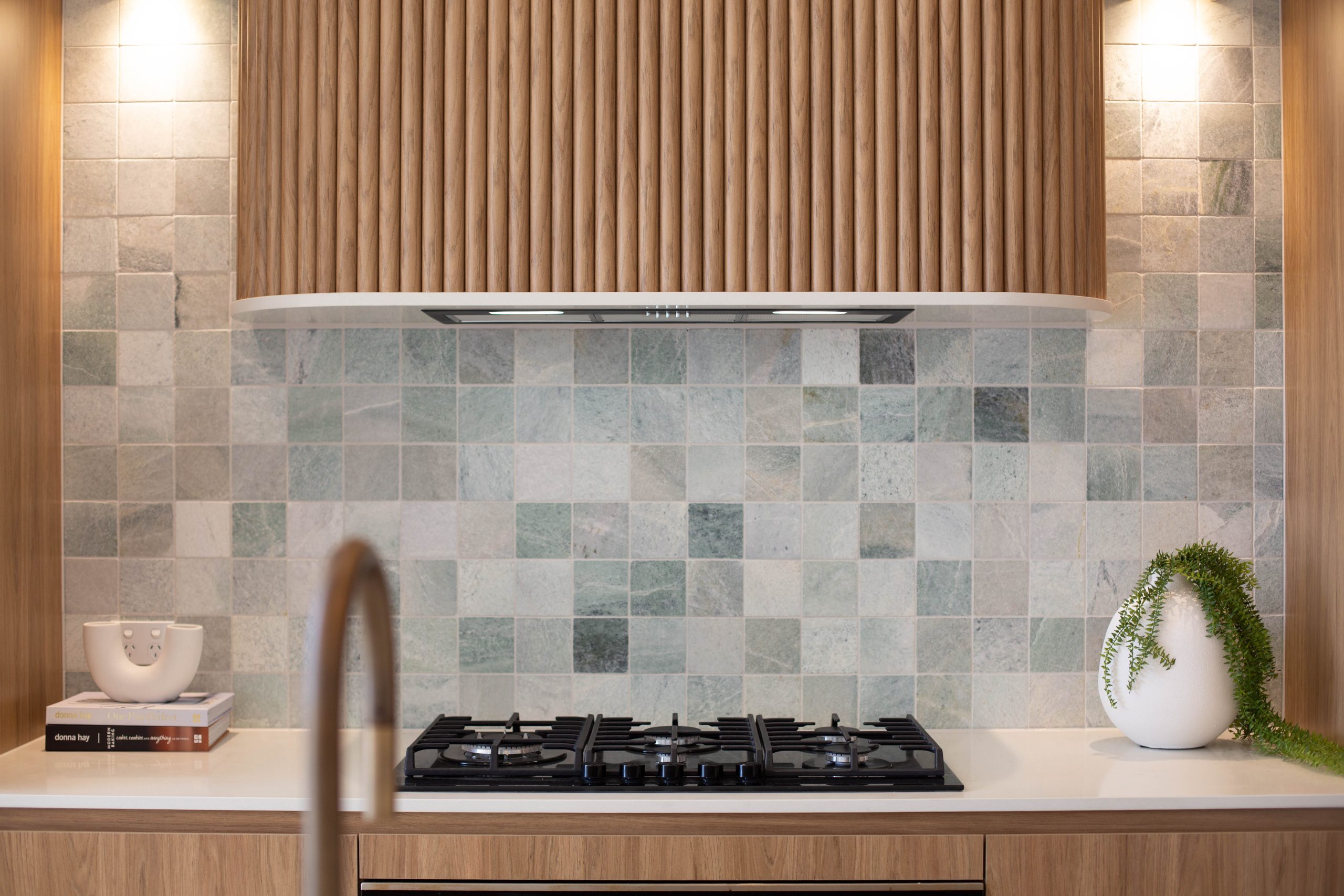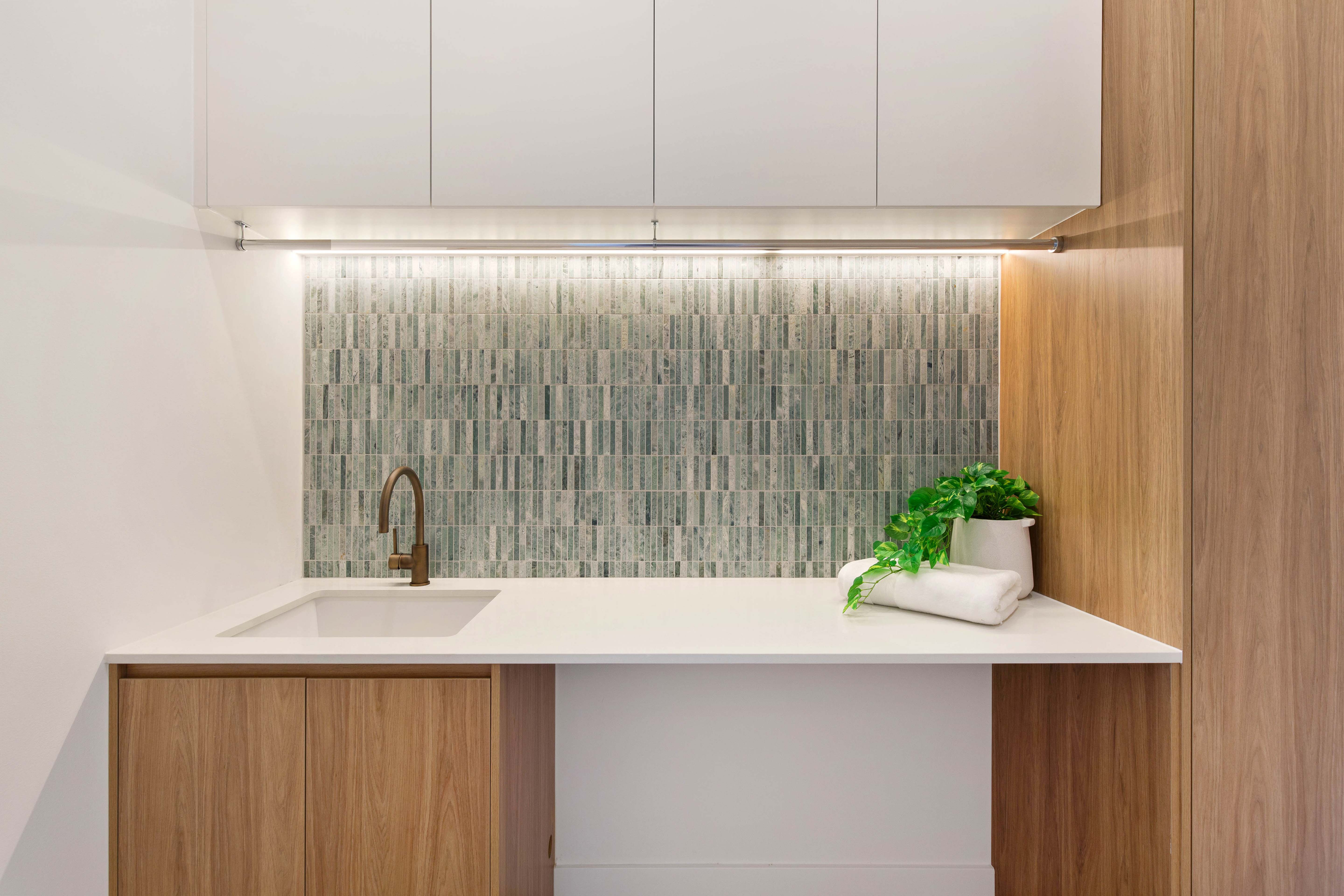 • Bathrooms finished with bespoke tapware, floating stone-and-timber vanities and a layered palette of natural textures. The main bathroom is defined by a sculptural freestanding bath, sleek frameless shower and a feature wall where natural green marble mosaic kit-kat tiles extend from the niche across the adjoining wall, creating a striking architectural focal point.