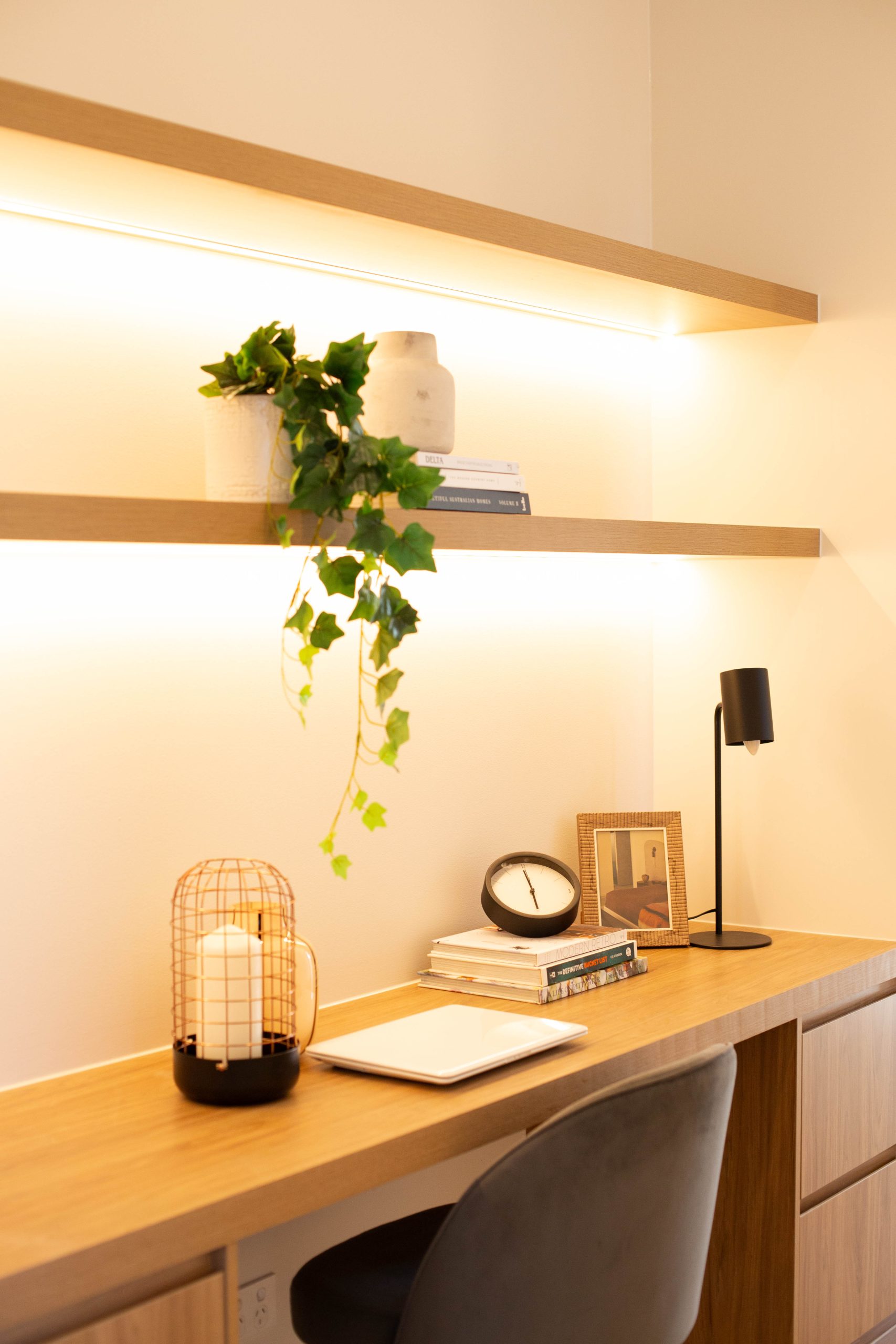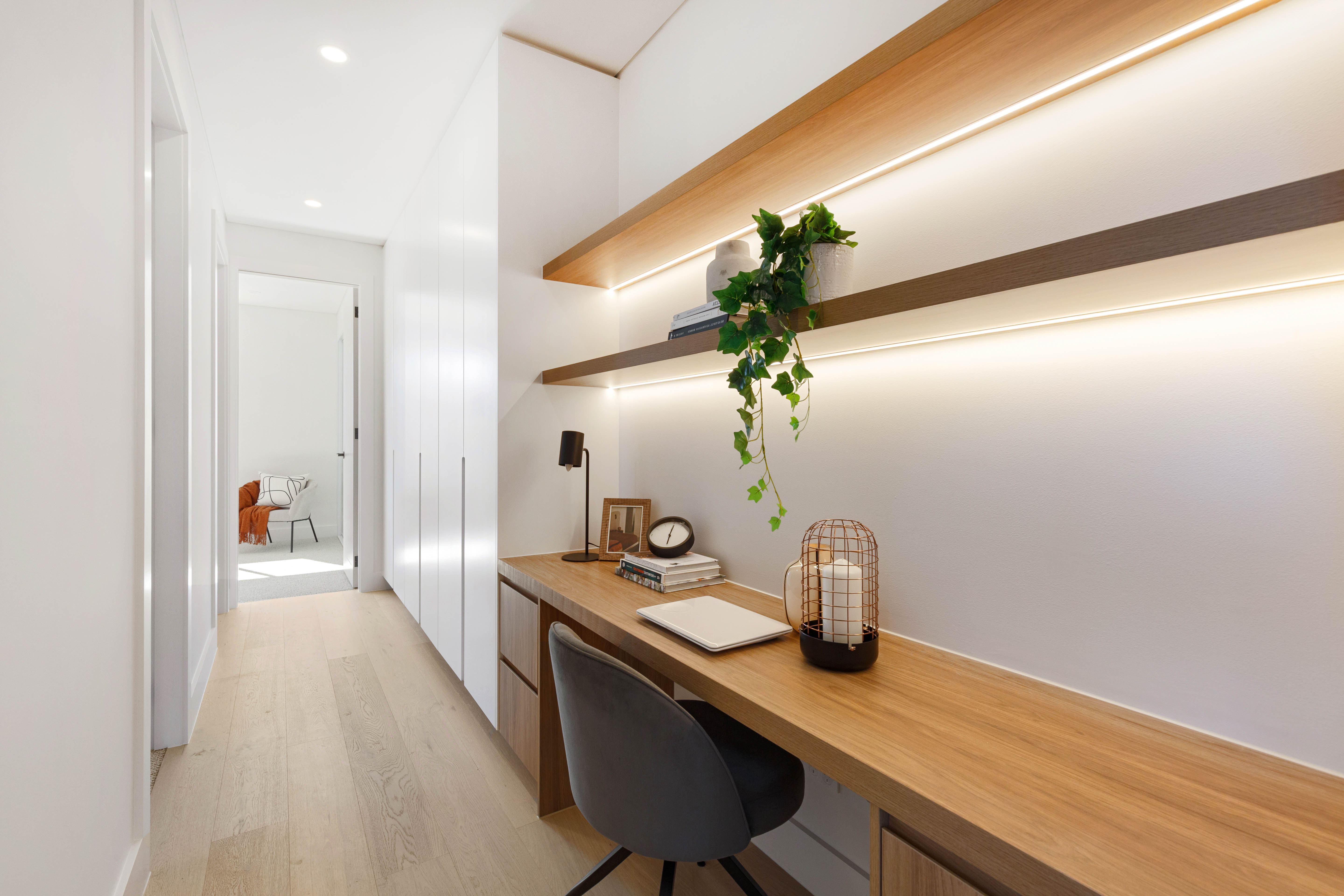 • Dedicated study nook positioned off the upstairs lounge, fitted with custom cabinetry, providing a quiet yet practical workspace for working from home or study, while maintaining connection to the home’s flowing layout.