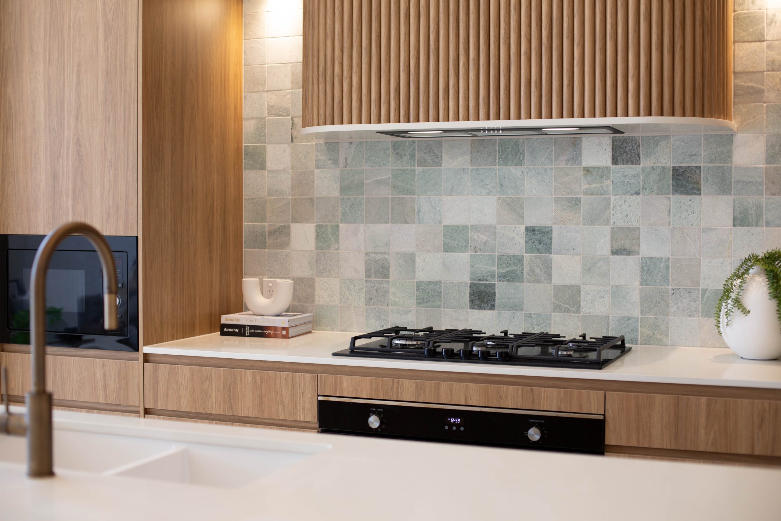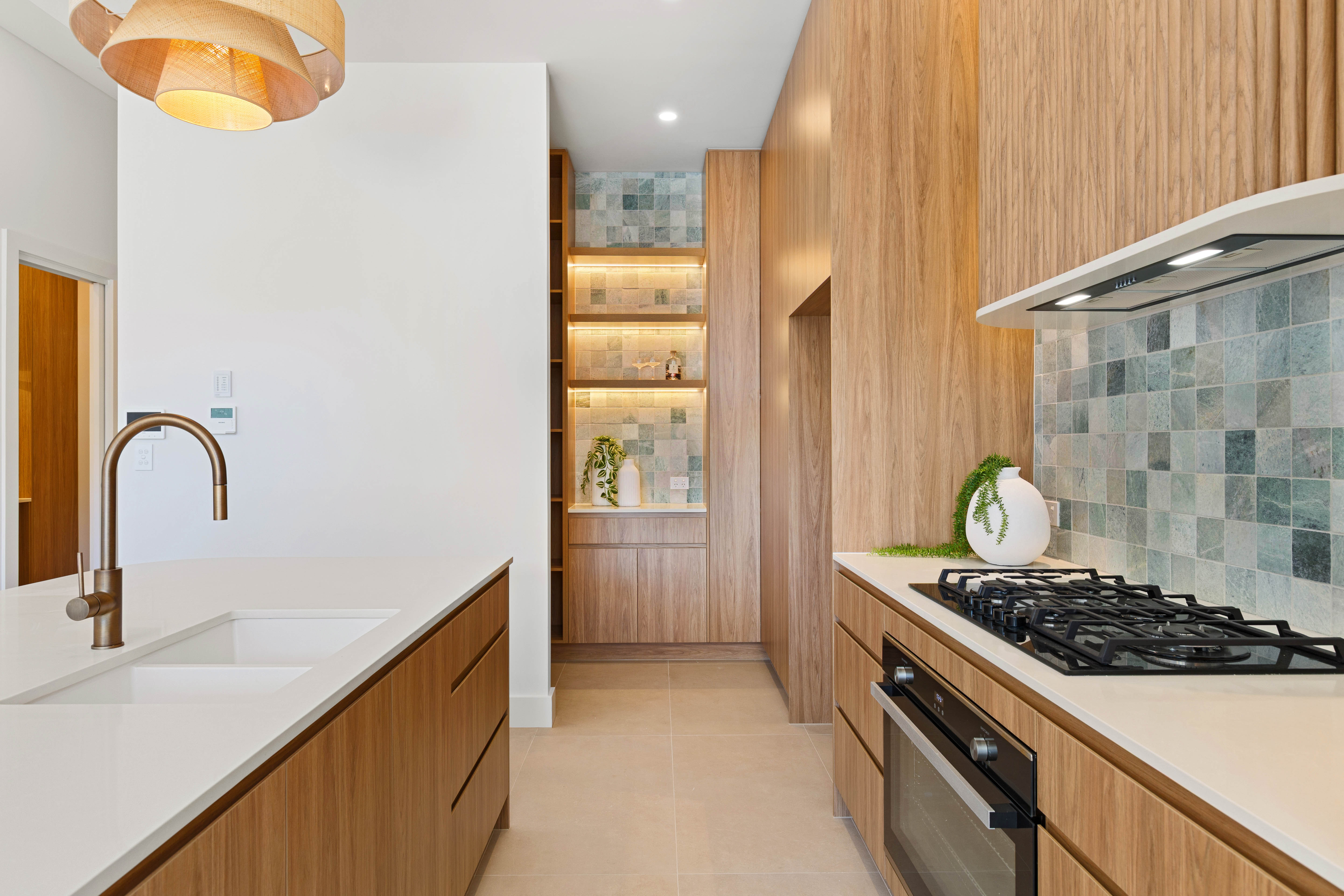 • Designer kitchen pairing refined style with functionality, showcasing a curved stone island wrapped in fluted timber detailing, oak cabinetry and a natural marble ocean-hued splashback. A concealed walk-in pantry with custom joinery and ambient lighting complements the main kitchen, which is fitted with premium appliances including a 900mm gas cooktop and integrated dishwasher, creating a space that balances elegance with everyday practicality.