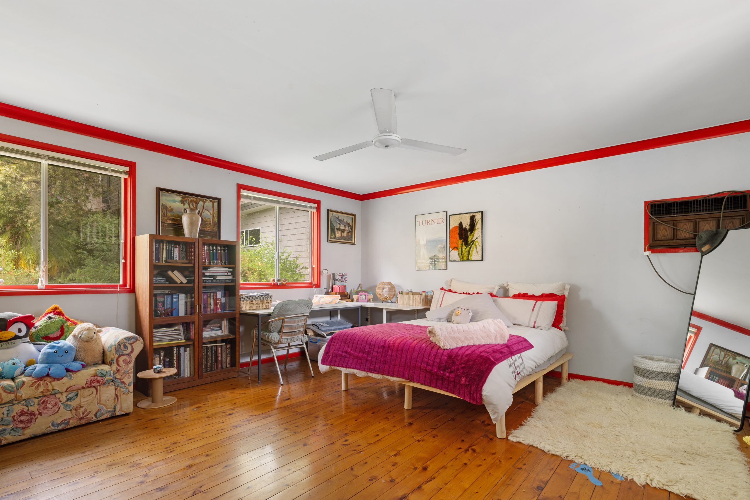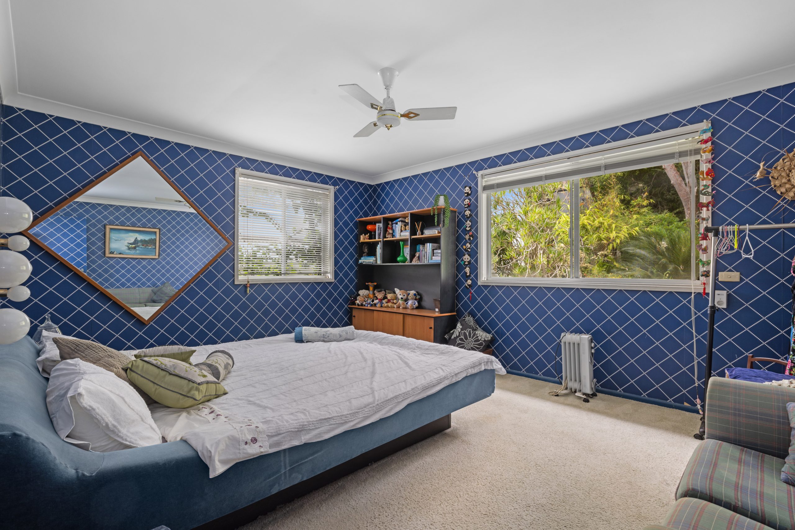 • Two oversized bedrooms positioned on the upper level, each appointed with ceiling fans and expansive windows that capture natural light and frame the tranquil leafy surrounds.
